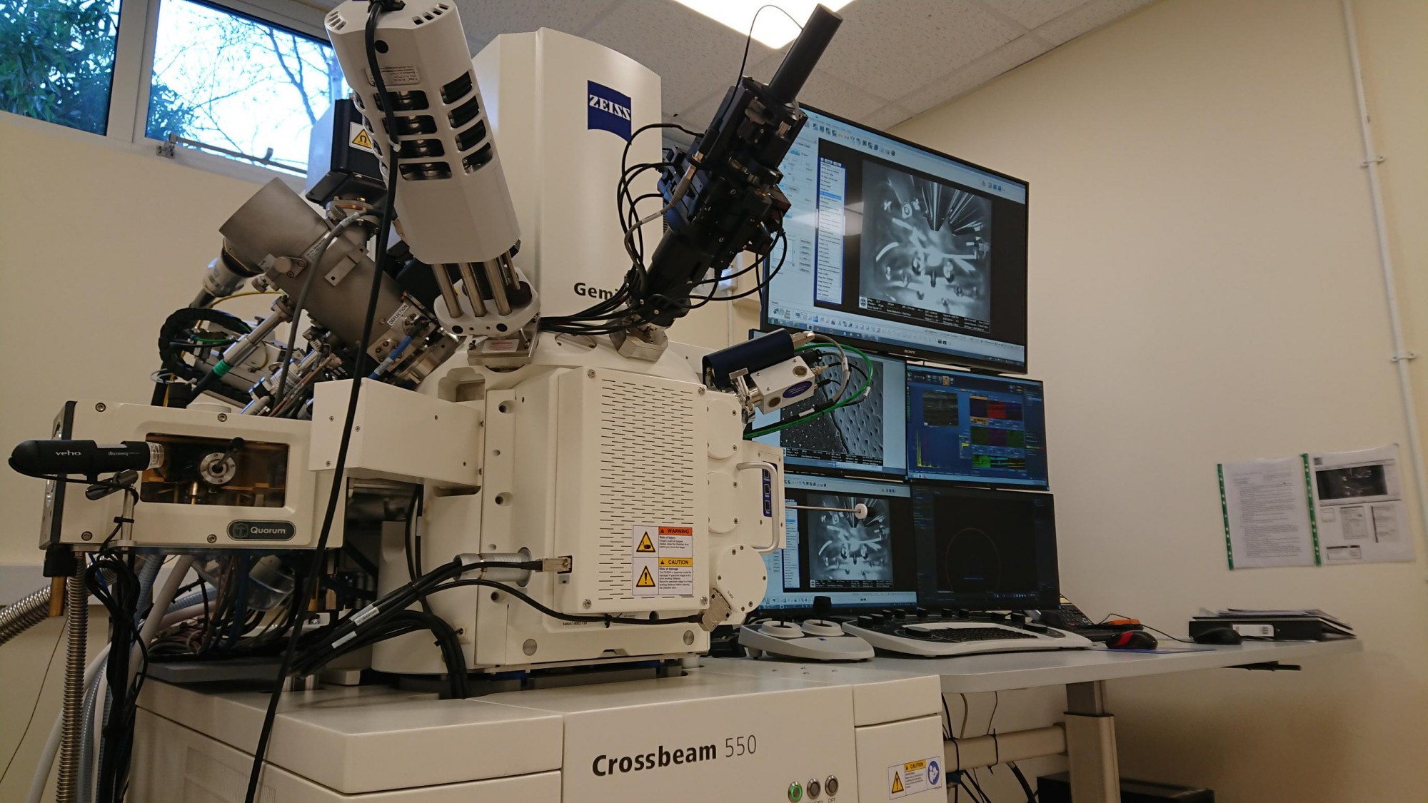 We are delighted to introduce our Cryo FIB-SEM facility, which is available to all researchers across the university. We also welcome external users from other universities and industry. This Zeiss Crossbeam 550 FIB-SEM with cryogenic attachment from Quorum Technologies is one of only a few such instruments in the UK and offers a multitude of powerful techniques to extract as much information as possible from a large range of samples. The microscope offers resolution down to ~1nm, elemental contrast and identification, fast and accurate milling and patterning using the focussed ion beam (FIB), nanoscale tomography, TEM sample preparation and the ability to work on liquids, gels, polymers, biological matter and many other materials using the optional cryo mode.